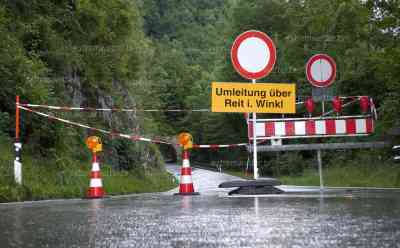 Dauerregen in den Alpen mit Regenmengen von bis zu 150 Liter auf dem Quadratmeter haben die Hochwassergefahr ansteigen lassen. Die Tiroler Ache führt bereits seit Sonntagvormittag Hochwasser. Der Grenzübergang nach Kissen wurde gesperrt, da kurz hinter der deutschen Grenze eine Mure abgegangen ist. Die Aufräumarbeiten werden noch bis Montagnachmittag andauern. Betroffen war auch die A 8 zwischen Bernau am Chiemsee und Frasdorf. Große Flächen stehen hier unter Wasser und auch die Autobahn war betroffen, musste am Sonntag halbseitig gesperrt werden. Noch bis zum Dienstag sollen die Niederschläge andauern. Die Hochwassergefahr könnte sich verschärfen.