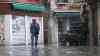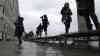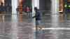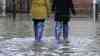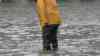 - Menschen laufen in Müllsäcken zum Schutz vorm Hochwasser